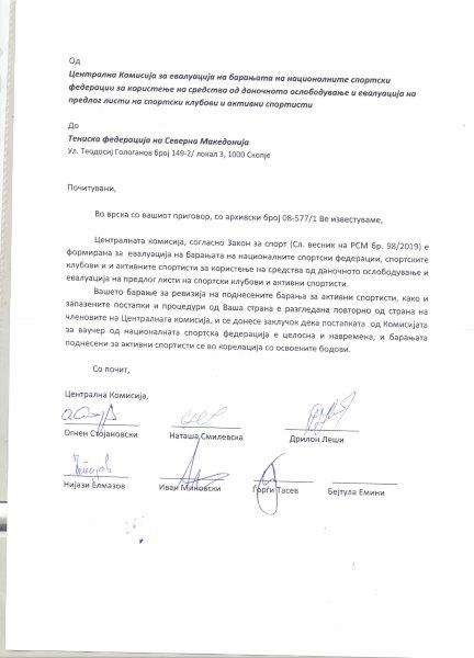 Одговор на Централната комисија за евалуација на барањата на националните споерски федерации- ваучери тенисери  27-04-2021